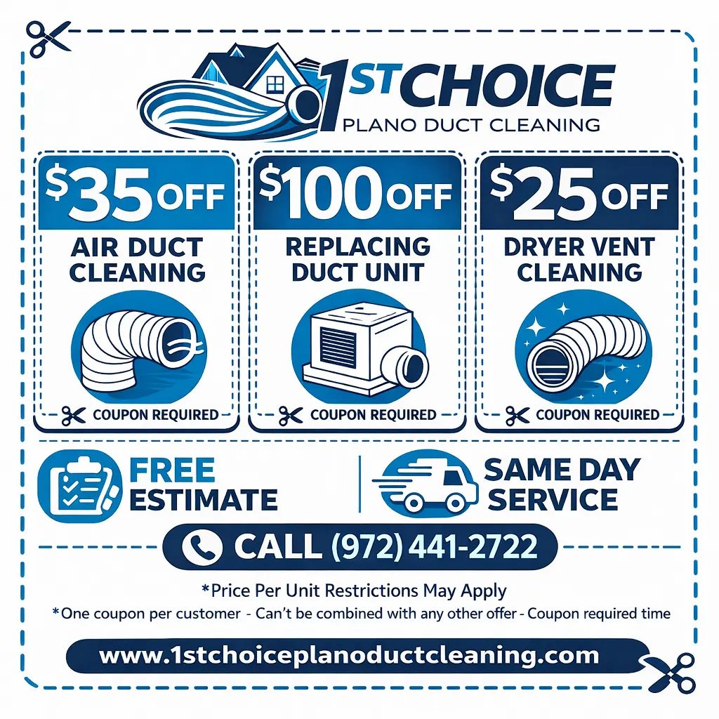 Save more on professional service with these limited-time deals from 1st Choice Plano Duct Cleaning. Take advantage of our exclusive discounts and enjoy cleaner air, better airflow, and more value for your home. Improve your indoor air quality and HVAC performance while saving on professional air duct cleaning in Plano.